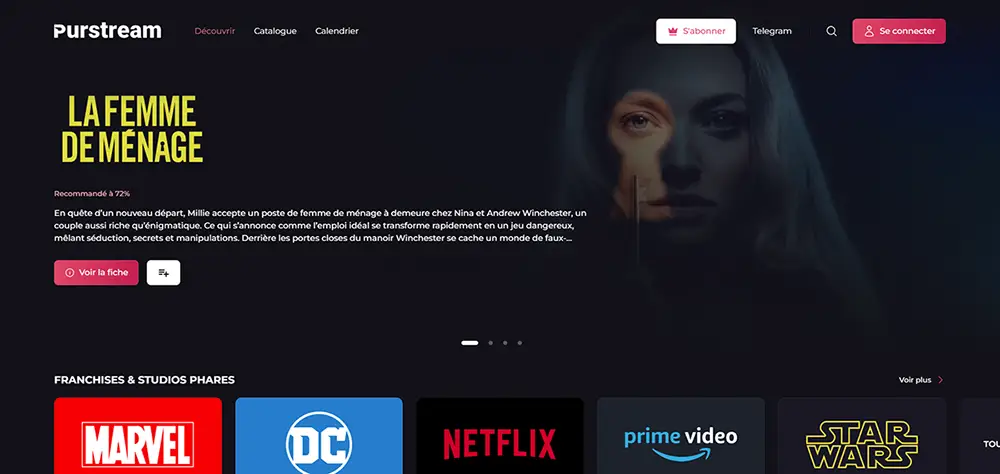 Purstream mise sur une expérience utilisateur optimisée grâce à une interface moderne et ergonomique. Le site offre un vaste catalogue de films et séries, disponibles en VF et VOSTFR, avec une qualité HD pour un visionnage agréable.